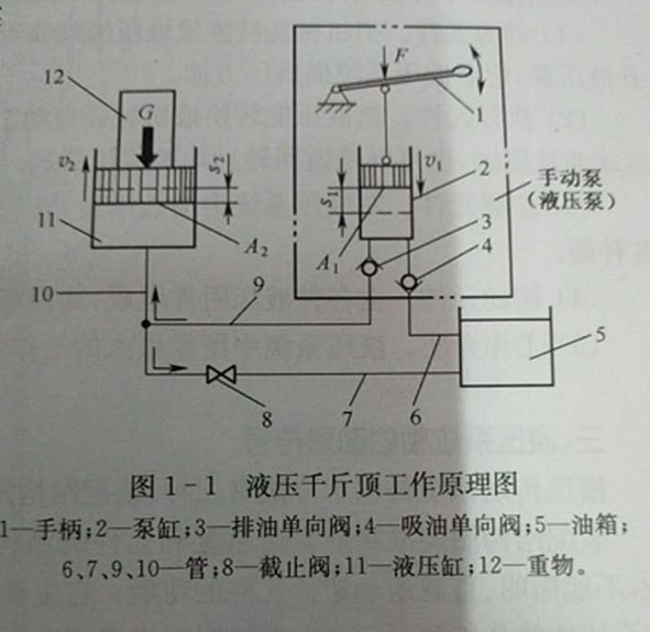 手柄1帶動(dòng)活塞上提,泵缸2容積擴(kuò)大形成真空,排油單向閥3關(guān)閉,油箱中的液體在大氣壓力作用下,經(jīng)管6、吸油單向閥4進(jìn)入泵缸2內(nèi):手柄1帶動(dòng)活塞下壓,吸油單向閥4關(guān)閉,泵缸2中的液體推開排油單向閥3,經(jīng)管9/10進(jìn)入液壓缸11,迫使活塞克服重物12的重力G上升而做功:當(dāng)需液壓缸11的活塞停止時(shí),使手柄1停止運(yùn)動(dòng),液壓缸11中的液壓力使排油單向閥3關(guān)閉,液壓缸11的活塞就自動(dòng)鎖住不動(dòng):工作時(shí)截止閥8關(guān)閉,單需要液壓缸11的活塞放下時(shí),打開此閥,液體在重力作用下經(jīng)此閥排往油箱5。