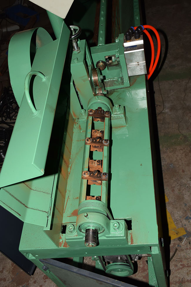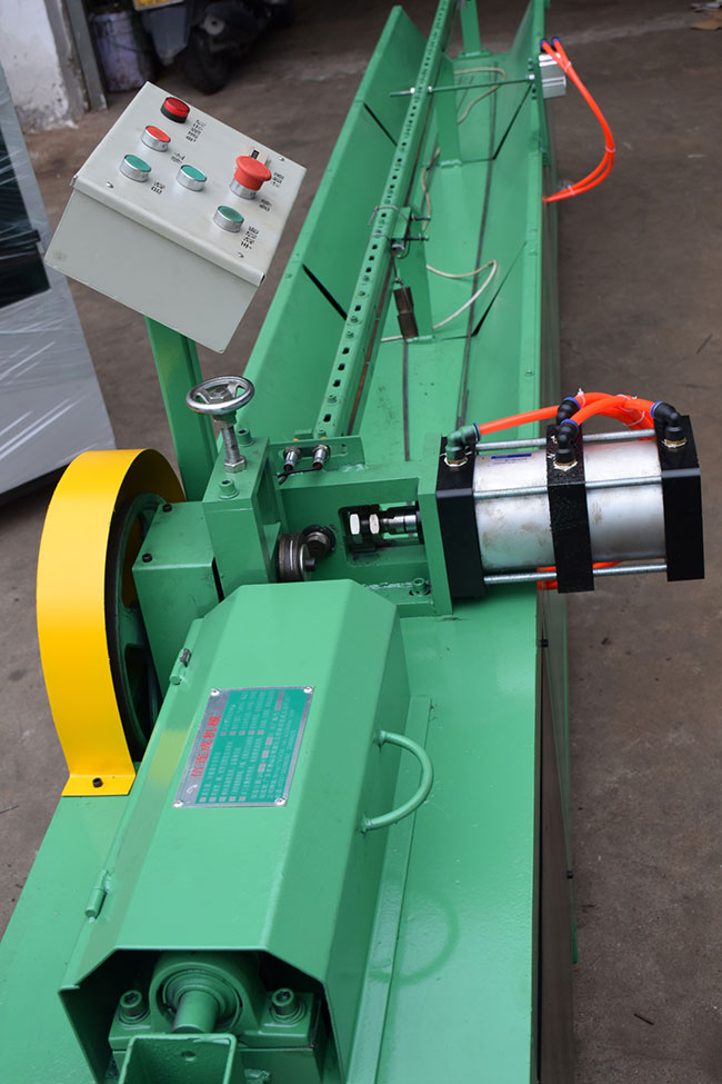 氣動調(diào)直機結(jié)構(gòu)是由高速轉(zhuǎn)子旋轉(zhuǎn)調(diào)整直絲模角度,達到調(diào)直的效果,然后通過調(diào)絲輪向前調(diào)絲。達到要求尺寸后,絲碰到定位鍵后把跑道向前進推進5毫米,上方?jīng)_頭壓住豎切絲刀就立刻切斷,絲通過豎絲刀上的壓板壓住開口軸承,絲就自動掉至托絲架,如果要改變長度,就移動定位鍵。